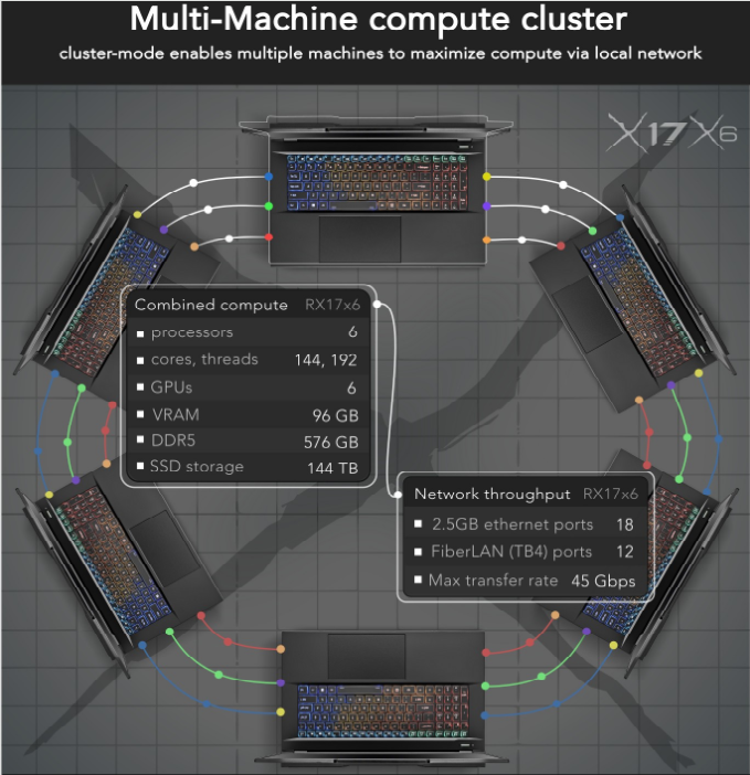 The connectivity and bandwidth are critical for setting a portable cluster of computing devices in a LAN configuration, such as EUROCOM Raptor X17 or Sky Z7 R2, for example, or any computing units that will be deployed as per customers' preference.