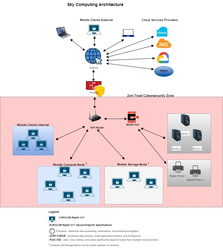 The architecture diagram represents Portable Compute Nodes that consist of devices set up in a cluster configuration and that provide computing and storage capabilities. The Zero Trust Cybersecurity Zone provides the protection of the resources.